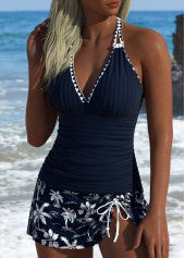 It includes a halter-style ruched tankini top and a matching printed skirt bottom.